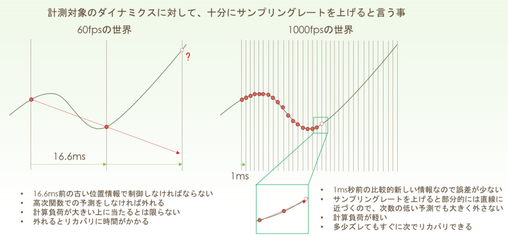 下記などで紹介してそれなりの反響を頂いたのですが、低遅延かつハイサンプリングレートで計算すると、計算している間に世の中が変化する分の補正に高次の補間が不要になり、かつ、前フレームの計算結果の差分だけの計算でよくなるため、アルゴリズムの不連続な進化が起こり、フレームレートを上げたのに演算量差が逆に激減し、精度も上がるといった事が起こるケースがあります。