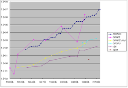 TOP500のような汎用計算機に対する、専用計算機の指標としてGRAPEのデータを拝借してみた。wikipedia などから適当にかき集めてきただけなのでいろいろと、集計ミスはありそうな気がしますが、ご容赦ください。