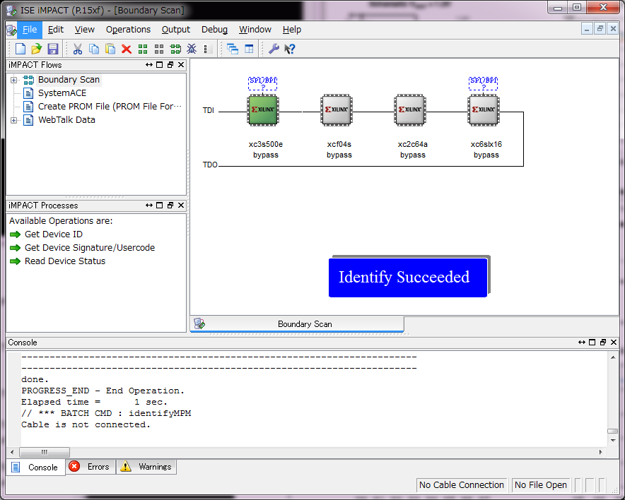 注文中のダウンロードケーブルがまだなので、Spartan-3E の評価キットのJTAGを引っ張り出しました。JTAGチェインの最後に 「XC6SLX16」 がちゃんと認識されています。