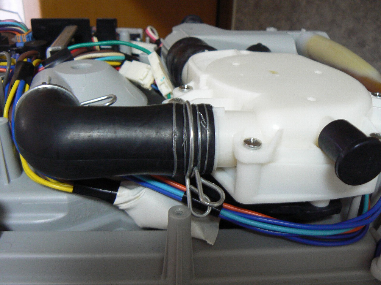 NP-60SS6 分解修理 その3 家電修理 2012.09.242025.11.11 先日書いた下記の記事のその後です。 NP-60SS6 分解修理 その2前回の続きである。その後、問題のパッキンを注文すべく電気店へ。なんと、ポンプユニットとしてしか扱えないので、ユニットごとの取り寄せで ,500 とのこと。がびょーん。このゴムの為だけに、,500ですかー?あきらめます orzNa... ポンプ内の弁を修理後、水漏れが始まってしまった。 下蓋をはずしたまま強引に運転してみると、すすぎぐらいまで進んだあたりで上の写真のゴムパイプ部分から漏れ始める。ゴムパイプにもEPDM表記があり、材質的に弁と同じなのでどうやらこちらも熱ダレしてきているようだ。 とりあえず暫定で、ステンレス線で縛れるだけ縛ってみた。ひとまずは収まったようだが、全体的にいろいろガタがきはじめており、そろそろ買い替え時かもしれない。 うーむ。