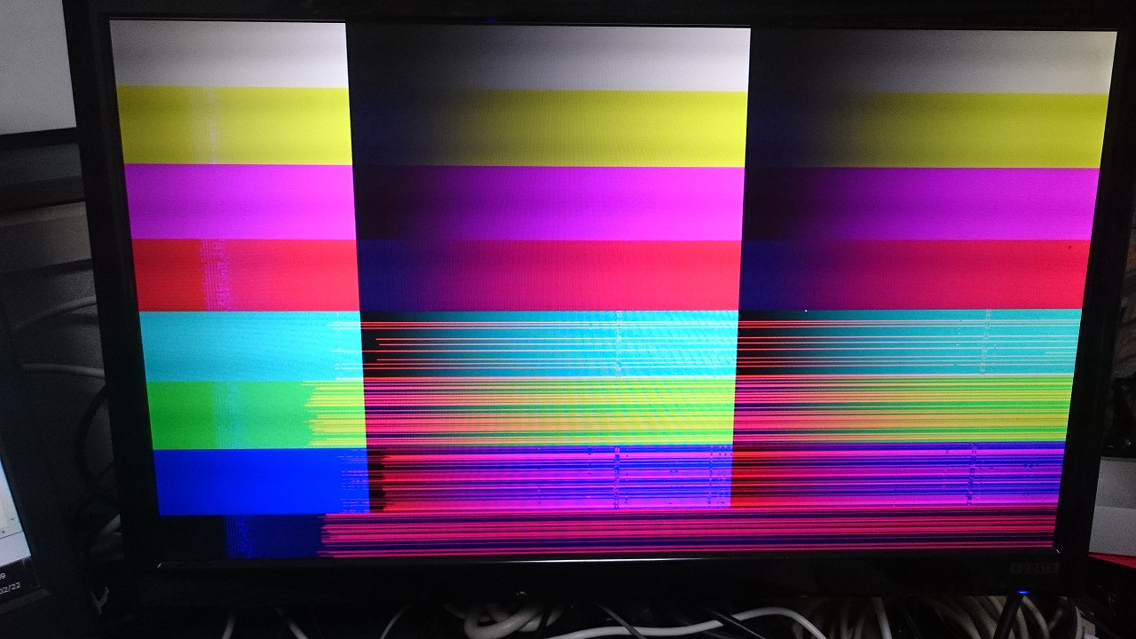 とりあえず書きなぐってVGA(ピクセルクロック25MHz)で動かして見ると、見事にノイズだらけ。