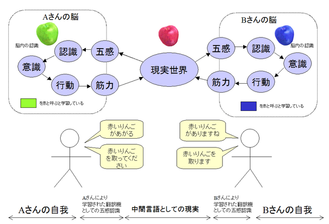 この場合、現実世界(リアル)は、まったく異なる脳内認識をしているAさんとBさんのコミュニケーションとして中間言語として機能します。