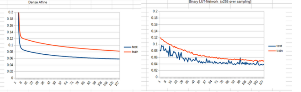 条件は十分揃えられてないのであまり比較にならない部分もあるのですが、通常のFP32でのDenseAffineとバイナリ疎結合の LUT-Network