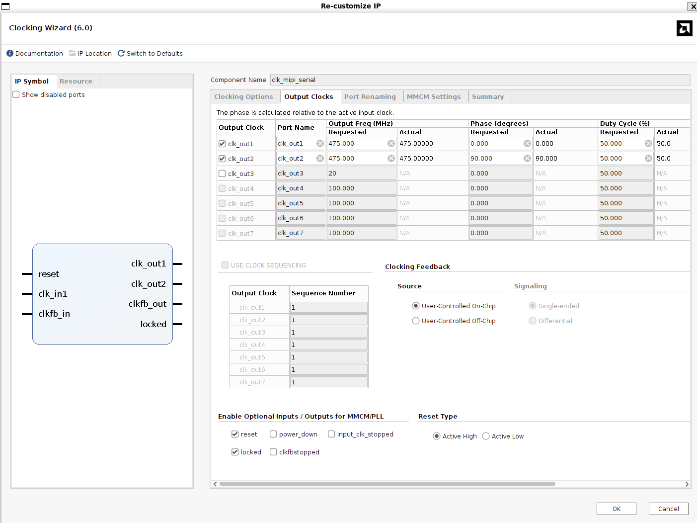 具体的には、AMD の DPHY-TX のIP にはいくつかのクロックを供給しなければいけないのですが、このなかで通信速度の半分の周波数のクロックを位相が90度のものと合わせて2つ供給しなければなりません。