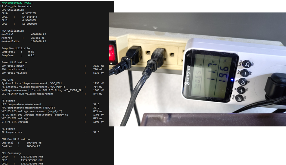 ここはAIを前提に INT8 で比較していきます。KV260 は DSP が 1248個あり、1個で INT8 の積和が2個できます(積和なので4演算)。最高周波数が 644MHz ですので、644M x 1248 x 4 = 3.2TOPS になりそうです。電力はまあ適当ですがアダプタなどの定格や経験則から15Wを置いておきます(xlnx_platformstatsコマンドとか電力計とかの経験上)。
