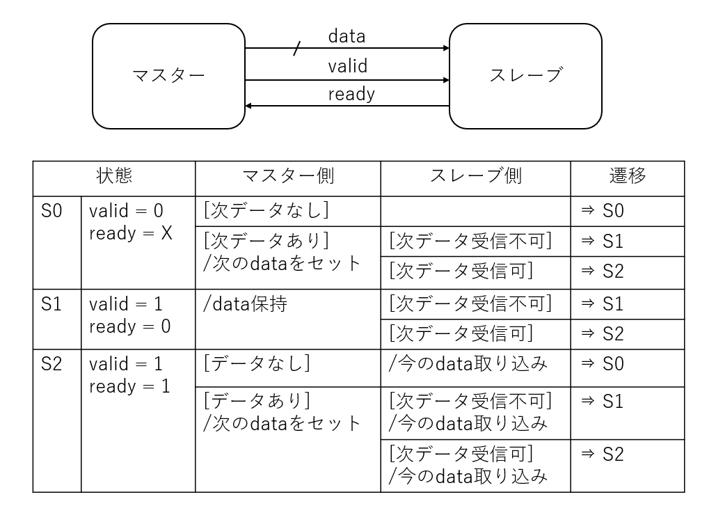 - クロックエッジが来た段階で valid と ready の両方が 1 であればデータ転送成立とする
