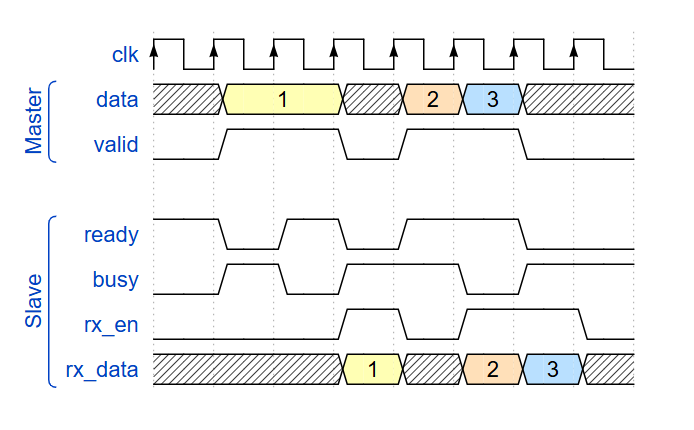 - マスター側は送りたいデータがあるときは データとともに valid を 1 にする