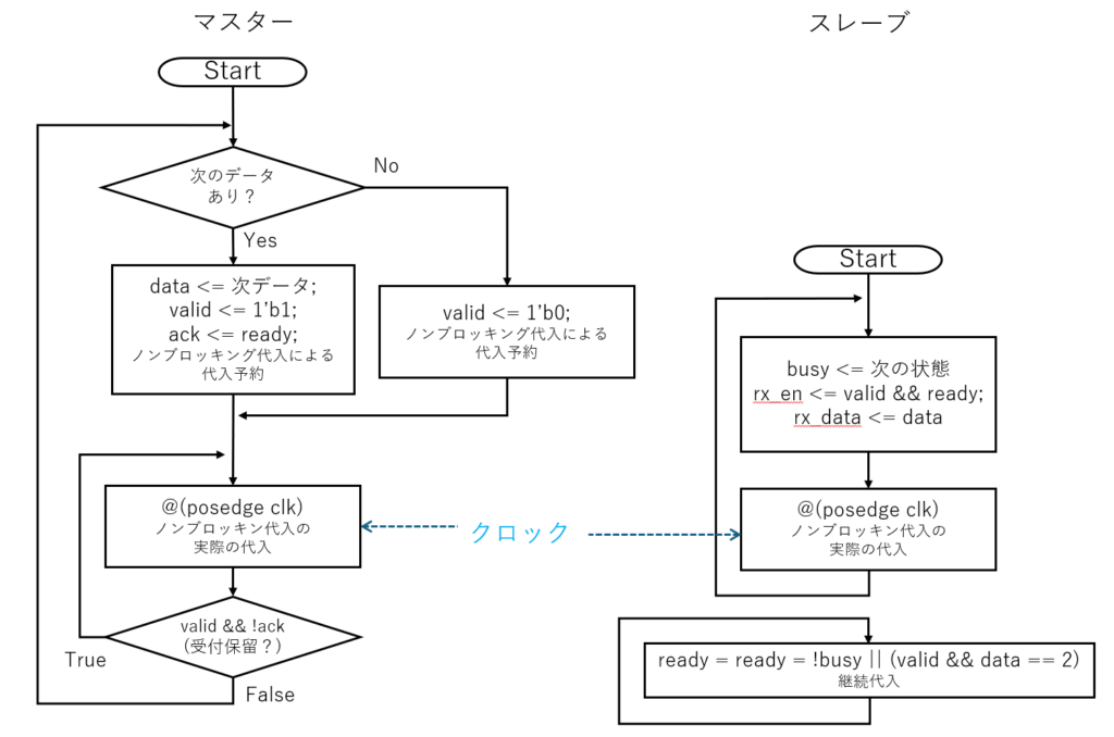 まずマスター側を見てみますが、先ほど valid を 1 にした後にそれが受け付けられたかどうかを知るのはその次のサイクルと書きました。なので @(posedge) でクロックエッジを待ってから受け付けられたかどうか判定して分岐するフローチャートにしています。