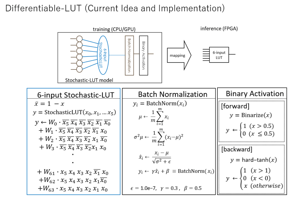 そのために考案した演算モデルが下記であり、LUTを微分可能な近似モデルに置き換えて学習することで、1個のLUTに非常に多くの情報量を持たせることができます。