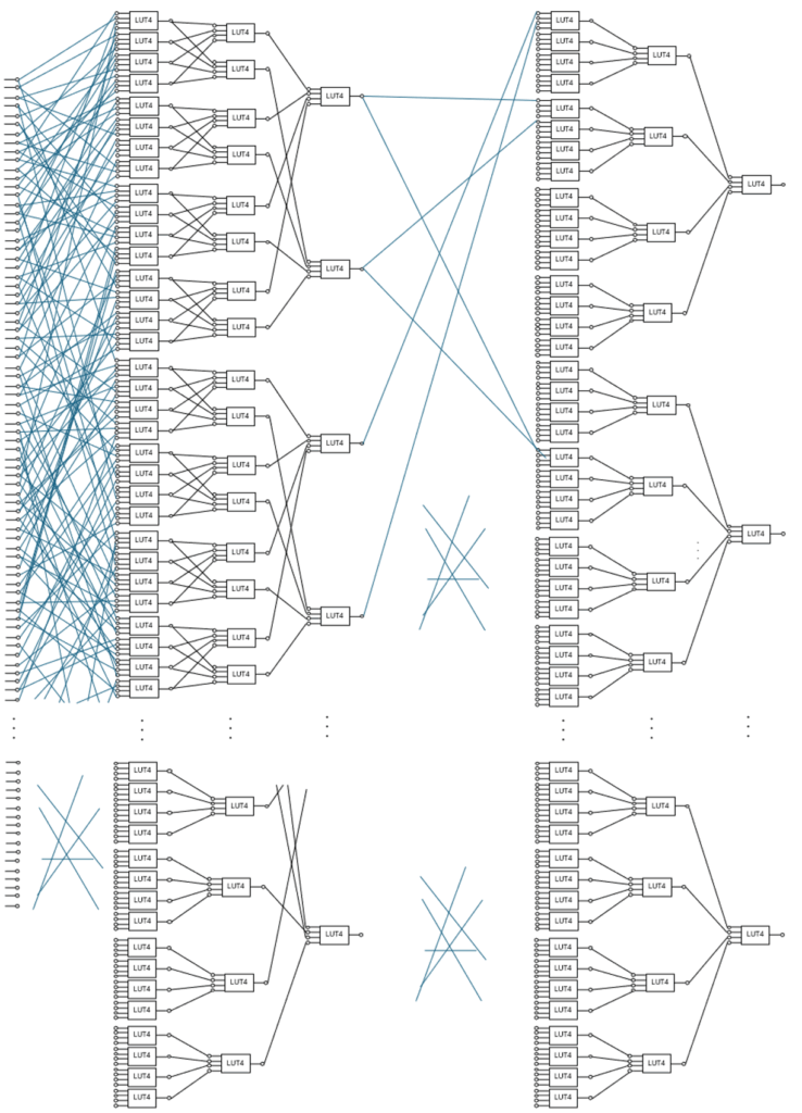 下記はあくまで一例のイメージですが、下記のように何十万個と言うLUTが組み合わさったネットワークを学習することが可能です。これは初めからFPGAの回路構造そのものを学習させているため大変コストパフォーマンス、電力パフォーマンスとも非常に高く、またデバイスのスペック上限に近い周波数で動作可能です。