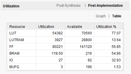 Zynq-7000 (XC7Z020)という安価な部類のFPGAに収まっており、リソース利用状況は下記のとおりです。カメラやディスプレイ制御、メモリ制御などの回路も入っておりますので、実質的にはAI認識部分は半分程度のリソースで収まっていると言えます。